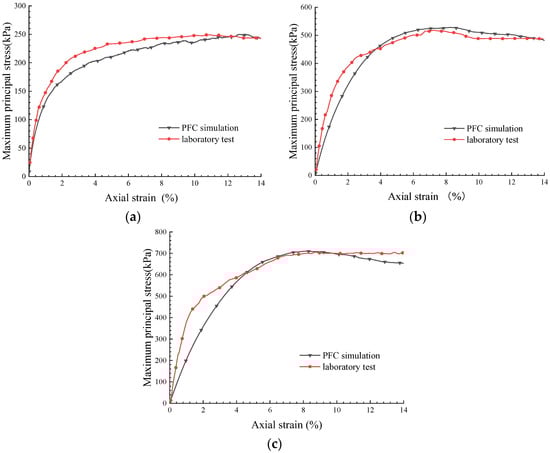 Figure 6. Comparison of discrete element simulation and laboratory test results. (a) Confining pressure 100 Kpa. (b) Confining pressure 200 Kpa. (c) Confining pressure 300 KPa.