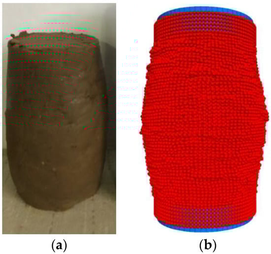 From Figure 6, it can be seen that at the initial stage of loading, there is a certain gap between the indoor test and the discrete element simulation stress–strain curve, but the overall trend is consistent, the similarity between the two is high, and the peak stress that the two can reach is maintained at the same level. Therefore, it can be considered that it is reasonable and feasible to simulate the unsaturated silt with the Hill contact model. It can be seen from Figure 7 that under the action of an axial load, the failure modes of the two are also similar, showing the form of bulging failure, which also confirms the accuracy of using the Hill contact model to simulate an unsaturated soil.