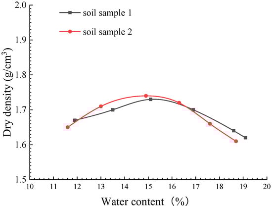 In the construction of an unsaturated soil roadbed, the maximum dry density is usually selected as the standard dry density in the construction process, and the corresponding water content is the optimal water content of the rolling compaction. For the unsaturated silt in the section of the Jingtai Expressway, two sampling sites with far intervals were selected for sampling, respectively, and an indoor standard compaction test was carried out to obtain the relationship curve between dry density and water content, as shown in Figure 8. It can be seen from the figure that the optimal water content of the two sampling points is 15%. Therefore, in the discrete element simulation, the soil sample with 15% water content was selected for research.