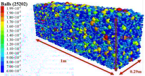 In this paper, a part of the unsaturated silt subgrade is selected as the research object, and a rolling model is established. The model size is 1 m × 0.29 m × 0.45 m. The contact between particles is set as the Hill contact. The contact parameters are taken from the Hill contact model parameters calibrated in Table 2. The particle size distribution is arranged according to the particle size distribution ratio in Figure 2b, and the particle size is scaled according to the overall size of the rolling compaction model.