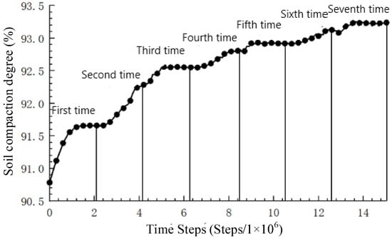Considering the changes in the compaction degree and contact force chain, after five times of rolling, the compaction degree of the compacted soil and the thickness of the rolling layer change with the increase in rolling times, but the overall change amplitude is very small, and the contact force chain between the particles is also in a relatively stable state. If the rolling is continued on this basis, the saturation of the soil sample will likely increase due to excessive rolling, which will promote the development of the soil sample from dry to wet, and reduce its bearing strength. Therefore, the reasonable rolling amount obtained by discrete element simulation is five times.