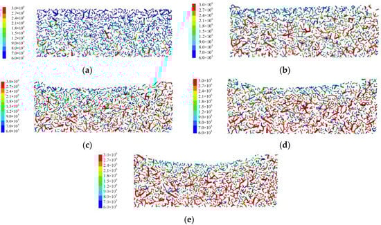 Figure 11. Distribution diagram of the contact force chain under different rolling times. (a) Not rolled. (b) Rolled once. (c) Rolled three times. (d) Rolled five times. (e) Rolled seven times.