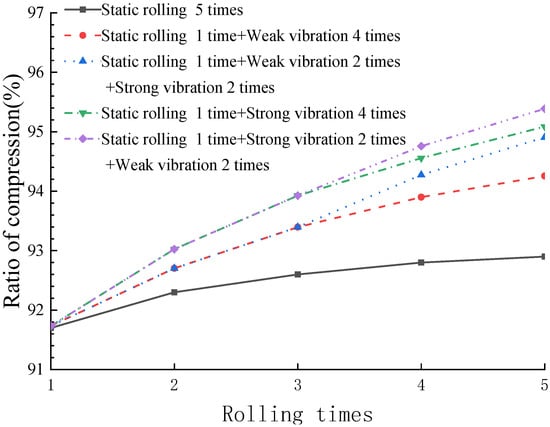 According to Table 5, it can be seen that improving the compaction effect of the soil samples by strong vibration or weak vibration alone is not obvious, and the compaction effect is better when only static rolling once + strong vibration four times. Compared with strong vibration rolling four times, the compaction degree decreases when the strong vibration rolling is carried out five times. The main reason for this phenomenon is that with the increase in the number of strong vibration rolling, the porosity of the soil sample gradually decreases, the water content increases, and the upper surface soil is bonded to the rolling wheel, which leads to the phenomenon of ‘peeling’ in the subgrade soil, leading to the decrease in the compaction degree.