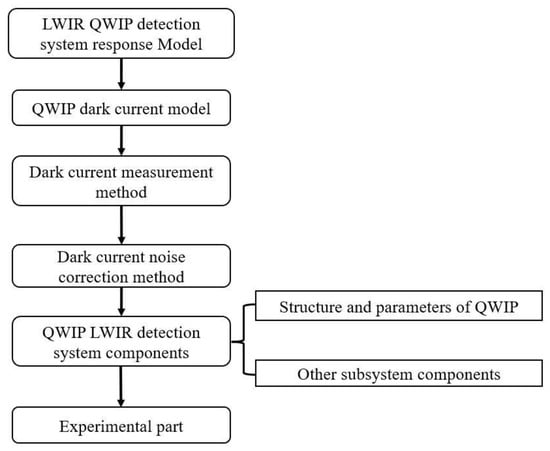 The main structure schematic of this paper is shown in Figure 1. Firstly, the response model and dark current model of the LWIR QWIP detection system are introduced. Then, the dark current measurement method is highlighted, and a dark current noise correction method is proposed. Then, the components of each module of the satellite-borne LWIR QWIP detection system used in the study are introduced. Finally, the experimental part is presented.
