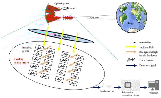 Figure 2 visualizes the response mode of the LWIR QWIP hyperspectral detection system. This detection system works on an Earth-orbiting satellite and periodically detects certain locations on Earth. The light from the target object passes through the main optics, the beam splitting system, the detector’s window, and the pixels in sequence. The radiation of the target in the same spatial dimension is spectroscopically divided by the hyperspectrometer. The value of radiation after spectroscopy is only 1% of that of the gaze-type detection system [23]. Therefore, the amount of target object radiation and incident photons received by the detector pixels is very small, while the effect of the spectrometer background radiation and the detector dark current is relatively greater.