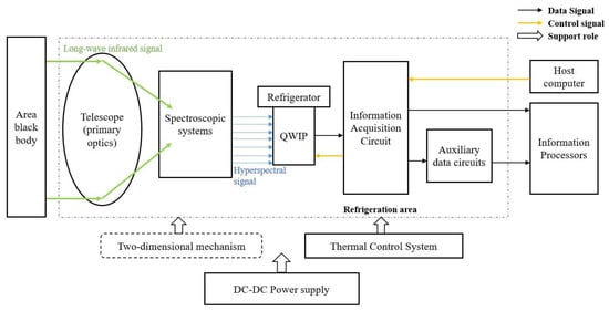 The LWIR QWIP detection system used in this study was designed by the team itself. As shown in Figure 3, it mainly consists of subsystems such as a detector (integrated cooler), information acquisition circuit, optical system, thermal control system, auxiliary data circuit, and information processor.