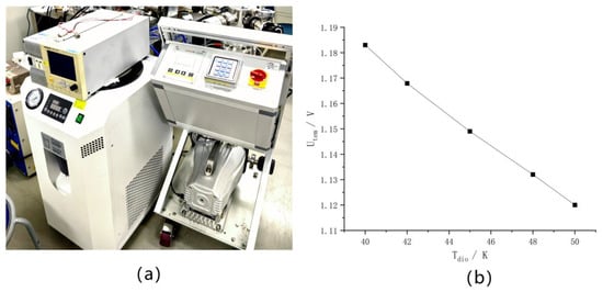As already described in Section 2.3, it was first necessary to carry out calibration experiments on the temperature of the chiller with the temperature measurement pin voltage to calculate the parameters in Equation (9). The refrigeration equipment is shown in Figure 5a using the equipment to adjust multiple chiller temperatures and measure the corresponding temperature measurement pin voltage . The experimental results are shown in Figure 5b, and and have good linearity. The linear fit yields an of and of 1.44 for this chiller. Most of the target cooling temperatures for QWIP in engineering applications are in the range of 40 to 50 K. Therefore, this temperature interval was chosen for the experiments.