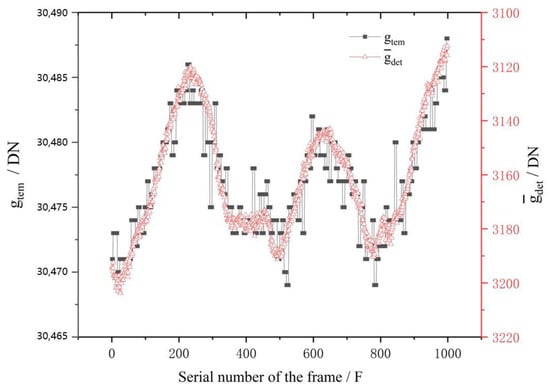 First, the detection system was turned on, and after the chiller stabilized the focal-plane device at the target cooling temperature of 41 K, 1000 frames of image data were acquired continuously facing the 300 K surface-source blackbody. As shown in Figure 7, the image data were processed, and the right side of the vertical axis is the mean response of the detector surface array pixels , the left side of the vertical axis is the acquired temperature response , and the horizontal axis is the sequence number of the frames. It can be clearly seen that the values of and are strongly correlated in the order of frame F. This also confirms that very small temperature fluctuations can cause changes in the dark current in the focal-plane.