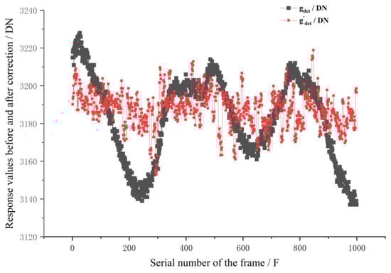 According to Equation (15), is 4.96. The target data were corrected according to Equation (16), and the corrected data were obtained. As shown in Figure 8, the response values and before and after correction using this method are compared; the horizontal axis is the serial number of the frame, the red curve is the response value after correction, and the black curve is the response value before correction.