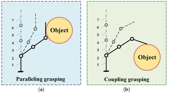 Paralleling grasping means that when grasping the object, the proximal phalanx rotates positively, and the distal phalanx rotates negatively at the same angle, which keeps the posture of the distal phalanx unchanged relative to the base. As shown in Figure 1a.