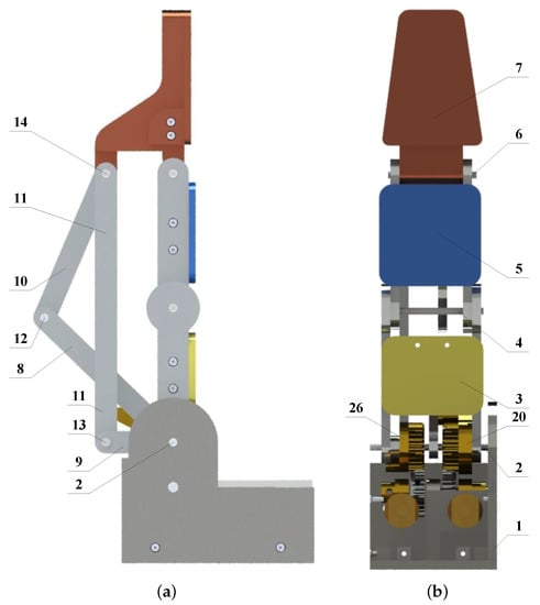 (a) Side view and (b) front view of the MCG finger. 1-Base; 2-Proximal shaft; 3-Proximal phalanx; 4-Middle shaft; 5-Middle phalanx; 6-Distal shaft; 7-Distal phalanx; 8-11-1st-4th linkage; 12-14-1st-3rd shaft; 15-1st motor; 16-1st reducer; 17-1st worm; 18-1st worm gear; 19-1st gear; 20-1st driving gear; 21-2nd motor; 22-2nd reducer; 23-2nd worm; 24-2nd worm gear; 25-2nd gear; 26-2nd driving gear; 27-28-1st-2nd pushing block; 29-31-1st-3rd spring; 32-33-1st-2nd limit block. All the numbers in the following figures represent the same component of the MCG finger.