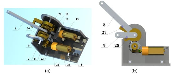 According to the design concept, the MCG finger combines six grasping modes and achieves a variety of grasping effects through the joint driving of two motors. The detailed structure is shown in the 3D assembly model shown in Figure 6 and Figure 7.