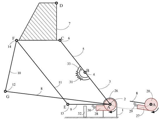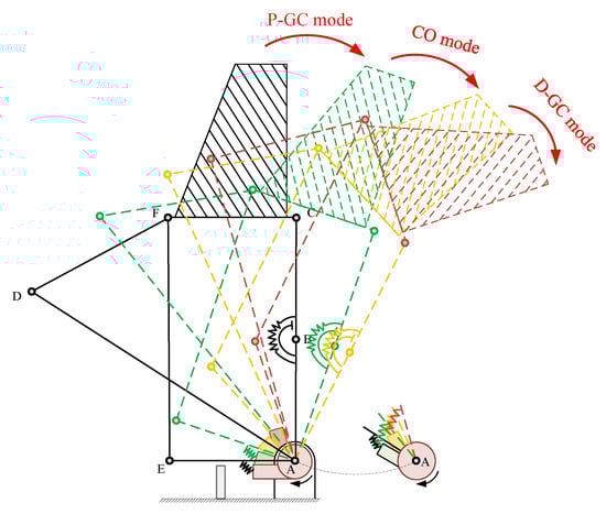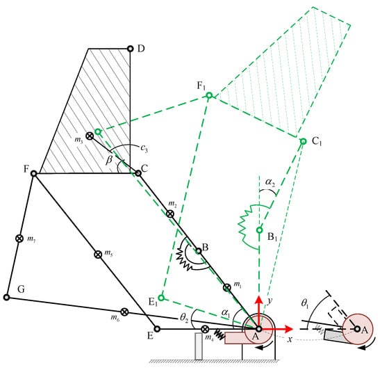 The first linkage and the first pushing block are connected by the first spring. Initially, the first spring has a pre-rotating angle , which will make them closely connected. The output torque of the first motor is , which acts on the first linkage through the first pushing block. The force of this moment acting on point G is: