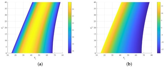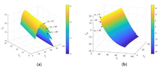 According to the derivation in Section 3.1, given the input torque and parameters in Table 2, we can obtain the force simulation when each phalanx of the MCG finger touches the object. The joint angle of the first linkage is obtained by the joint angle of the second linkage, middle phalanx, and middle phalanx. After re-arranging the joint angle, we can obtain the force of each phalanx in the x and y directions under the different joint angles of the first linkage and the second linkage.