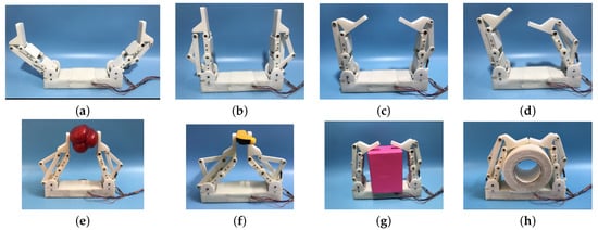 Grasping experiments of the MCG finger. (a) Initial state of parallel grasping mode, (b) Initial state of coupling grasping mode, (c) Gesture changeable grasping mode, (d) Coupling grasping mode, (e,f) paralleling grasping experiments, (g) Coupling grasping experiment, (h) Middle phalanx and distal phalanx self-adaptive grasping experiment.