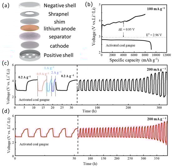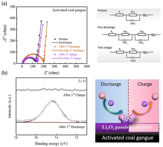 - After acid–alkali activation, abundant functional groups and oxygen vacancies were exposed on the surface of the coal gangue, which could play a key role in improving the formation/decomposition efficiencies of discharge products (Li2O2) as highly active electrochemical reaction sites.