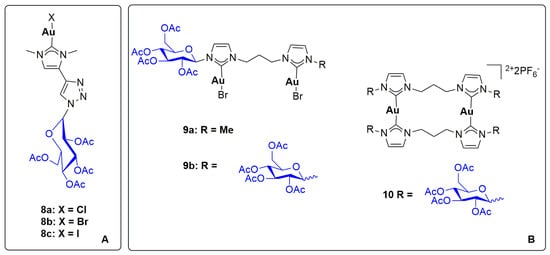 As far as concerns the position and number of glycosidic moieties in a gold complex, Tubaro and colleagues have investigated a selection of dinuclear gold derivatives (Figure 2B) [58]. In particular, complexes 9a–b and 10 were synthesized and tested towards A431 and SVT2 cancer cells and HaCaT and BALB/c3T3 normal ones. Notably, the anticancer activity of the corresponding Au(III) complexes was not explored due to their poor stability in the physiological solution.