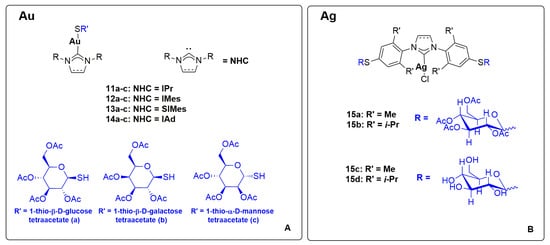The well-known antiarthritic and antitumor properties of Auranofin have prompted many research groups to use thioglucosidic residues in the design of new promising metallodrugs. Taking advantage of the weak-base route [59], Nolan, Ott and Martin have recently reported the S-H activation of thiosugars under mild conditions, affording the desired gold complexes 11–14 with a wide scope of NHC ligands (Figure 3A) [60]. The synthesized complexes have been tested in relevant human cancer cell lines such as A549, HT-29 and MDAMB-231. All the tested compounds exhibited a remarkable anticancer activity, with IC50 values in the low micromolar or sub-micromolar range. Interestingly, the most promising results were obtained in the case of thioglucose tetraacetate as thiosugar.