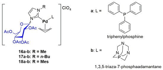 Organopalladium complexes have recently been considered as promising anticancer agents, owing to their remarkable in vitro, ex vivo and in vivo cytotoxicity even on cisplatin-resistant tumour models [62,63,64,65,66]. Recently contributions from our group have demonstrated the interesting anticancer properties of Pd(II)-allyl complexes bearing NHC and phosphine ligands [67]. More specifically, the use of PTA (1,3,5-triaza-7-phosphaadamantane) as phosphine ligand improves the solubility and stability of the Pd complexes in physiological conditions as well as their selectivity towards cancer cells. Moreover, this category of organopalladium derivatives seems to target mitochondria. With the aim of further improving their activity and selectivity, in 2020, we reported the use of glucosidic-NHCs as ancillary ligands in Pd(II)-allyl complexes. The desired complexes 16a–b, 17a–b and 18a–b were successfully obtained as a mixture of four diastereoisomers and then tested as potential anticancer agents (Figure 4).
