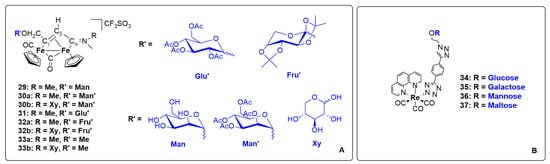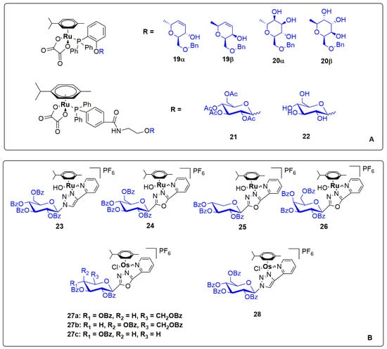 Ru(II) and Os(II) neutral (A) and cationic (B) complexes bearing glycosidic moieties.