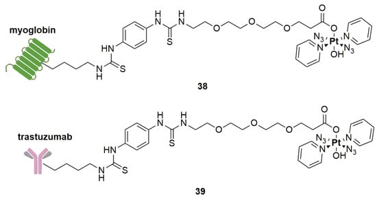 As already mentioned in the previous sections, octahedral Pt(IV) complexes are usually prodrugs [51]. The conjugation with a protein requires a water-compatible procedure that does not affect the protein conformation and allows the release of the cytotoxic payload once it reaches the tumour. Saldler and Imberti have described the photoactivable Pt(IV) azido compounds conjugated to myoglobin and trastuzumab antibody (complexes 38 and 39 in Figure 7) [85]. The conjugation with myoglobin is higher than with trastuzumab, and although both derivatives are stable in the dark, unfortunately, an extensive photodecomposition was observed during the preliminary tests.