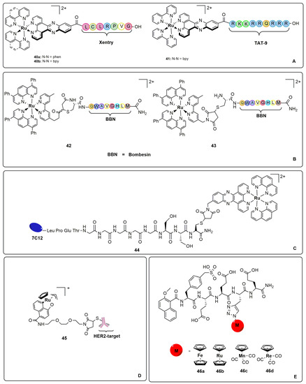 In order to improve the panel of photosensitizers (PS) employed in photodynamic therapy (PDT), Gasser and Gois have proposed the conjugation of [Ru(bphen)2(dmbipy)]+ complexes with Bombesin peptide bearing a N-terminal Cys. The latter is known have high affinity with human gastrin-releasing peptide receptor (GRPR), which is overexpressed in many solid tumours [89]. Complexes 42 and 43, depicted in Figure 8B, were tested in PC-3, HT-29 and CT26 cancer cell lines in dark and light conditions, comparing the IC50 values to the non bioconjugated metal complexes. Bioconjugation has permitted us to maintain the cytotoxicity only in dark conditions (IC50 = 0.5–18 µM) in both complexes. Moreover, the general decreasing in cellular uptake was observed in the CT26 line, showing the highest accumulation of drug in lysosomes [89].