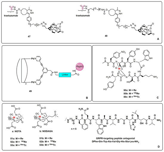 (A) 64Cu trastuzumab radiolabelled complexes; (B) Palladium metallacages; (C,D) Re and Tc complexes synthesized by Hennkens.