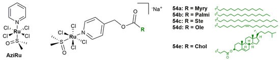 The encapsulation of drugs in lipid nanoparticles is a common and effective strategy to improve the drug delivery. In this context, Ru(III) derivatives synthesized by Montesarchio and co-workers are particularly worthy of mention. These octahedral complexes are characterized by the presence of a pyridyl ligand functionalized with a lipid chain, which facilitates the self-assembly in pseudo physiological conditions, with the resulting system that remains stable for hours [104]. More in detail, the behaviour of complexes 54a–e has been investigated and compared to the non-lipid functionalized pyridine precursor AziRu (Figure 10).