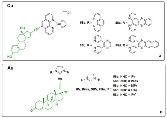 Steroids are important delivery vectors that can be used to target overexpressed oestrogen receptors (ER) cancer cells, such as those of breast, ovarian, colon and prostate tumours. The bioconjugation of oestrogen derivatives with the biocompatible copper metal centre has been studied by Erxleben and colleagues with the aim of understanding the interaction of phenanthroline ligands with DNA [105]. The oestradiol–copper complexes 55a–d (Figure 11A) are more effective than cisplatin against A431, MCF-7, 2008, A2780 ER+ and HCT-15 ER-cancer cells. The low and sub-micromolar activity has been confirmed even in 3D spheroids models, increasing with the lipophilicity of the phenanthroline ligands. The authors have shown that complex 55d is the most active, stimulates the production of ROS, and its uptake improves in a time-dependent manner. Overall, the activity of this class of compounds can be mainly ascribed to the electrostatic interaction (intercalation) with DNA, being scarcely able to establish covalent bonds [105].