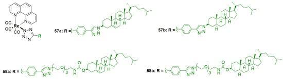 Cholesterol is an essential multifunctional lipid involved in the control of eukaryotic cell membrane stability and permeability as well as a precursor to steroid hormones, bile acid and vitamin D3. Basically, its uptake takes place via endocytosis with low-density lipoproteins (LDL) to reach the endoplasmic reticulum. Cholesterol is present in high level in cancer cells, and for this reason, it is combined with rhenium for imaging applications, originating luminescent organometallic complexes which exhibit reduced photobleaching, large Stokes shift and long emission lifetimes compared to traditional organic fluorescent moieties. Adopting the classical click chemistry, it was possible to synthesize Re-cholesterol and cholestanol complexes 57a–b and their tetra ethylene glycol (TEG)-linked analogues 58a–b (see Figure 12). Unfortunately, for solubility issues, only complex 58b was investigated towards PC-3, LNCaP and 22Rv1 prostate cancer cells and PNT1a non-malignant cell line. The treatment with 5µM solution showed a higher uptake on cancer cells than non-tumoral ones. In particular, the complexes exhibited high cytotoxicity towards androgen-independent PC-3 cells, with the major accumulation in endosomes/lysosomes compartments [107].