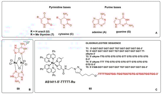 (A) Purine and pyrimidine bases; (B) Dinuclear Ru complex; (C) Ru aptamer complexes.