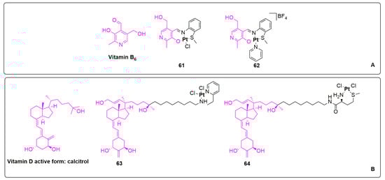 Pyridoxal, the natural form of vitamin B6, is a co-factor in enzymatic processes which is engaged in the metabolism of proteins, lipids and carbohydrates. Vitamin B6 mediates a wide range of biochemical reactions and influences cell growth. A few transition metal complexes based on pyridoxal exhibit strong antimicrobial and anticancer activities [111,117,118], and the first example of a Pt(II) derivative has been recently published by Rahman, Bhatti and co-workers [119]. More specifically, a vitamin B6 scaffold has been incorporated into a Schiff base ligand bearing ONS-donor atoms. Complexes 61 and 62, depicted in Figure 14A, induce follicular thyroid cancer (FTC) cell apoptosis showing a dose-dependent manner cytotoxicity. IC50 values have been determined by MTT assay and have been found comparable to cisplatin (IC50 = 9.6, 7.2 and 6.2 µM for 61, 62 and cisplatin, respectively). As free ligands are inactive, their coordination with the platinum centre is essential to promote their activity [119].