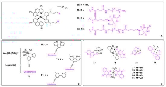(A) Ru-biotin complexes; (B) Mn CORMs cobalamine complexes; (C) Vitamin E-based metal complexes.