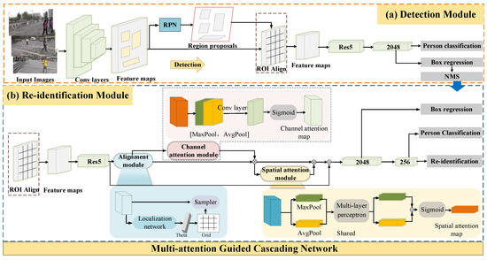 To tackle this issue, person search is proposed to be exploited for search tasks within a given scene, which skillfully combines detection and re-identification tasks [14,15] in a unified framework. Typically, these methods are required to detect multiple persons of different scales in real-world images and re-identify them based on the detected labeled information. Zheng et al. [16] introduced a novel dataset for person search tasks, which contains videos collected by six cameras. This method proves that the detection task can be beneficial for improving the re-id performance of the target pedestrian. Chen et al. [17] segmented the foreground person from the original image to obtain each personβs identification information. The re-identification algorithm is then employed to extract discriminative features from both the original image and the foreground person separately. Although the aforementioned two-step methods have yielded satisfactory results, they increased the calculation cost and time. Therefore, in practical applications, numerous joint frameworks have been suggested to solve the person search problem. Xiao et al. [18] introduced an online instance matching (OIM) loss function that integrates person detection and re-identification tasks into a single convolutional neural network. Furthermore, Munjal et al. [19] extended the OIM algorithm to take context information from queries and gallery images into consideration. It can be found that both one-step and two-step person search methods need reliable embedded feature representation to achieve accurate retrieval. Above all, person detection tends to extract global features in the scene, and then distinguish the different features between the background and instances, while re-id task needs to distinguish the differences between various similar persons. Therefore, an effective multi-attention end-to-end framework should be introduced for completing person search tasks, which is competent to extract multiple noteworthy features based on the valuable information collected from multiple people.