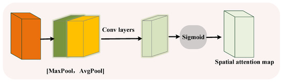 Therefore, we construct a spatial attention map by utilizing the spatial relationship between multiple pedestrian features, which focuses on the location of significant information and complements the channel attention information. First, MGCN applies the maximum pooling and average pooling procedures along the direction of feature channels to generate two attention maps, which are, respectively, represented as and . The resulting features are passed through a standard convolution layer to generate the spatial attention map .