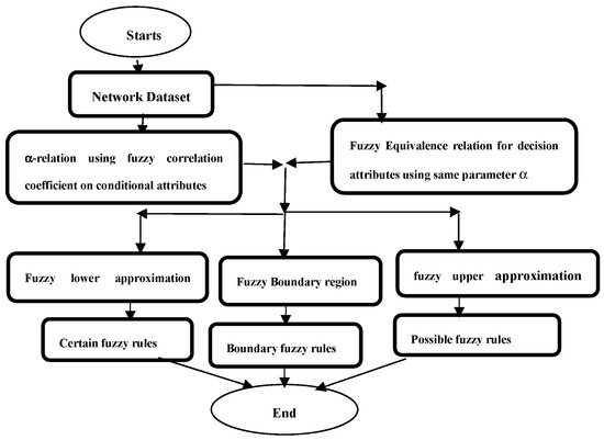 The first step of the proposed method is to compute α-relation of the conditional attribute using correlation coefficient, and compute the equivalence classes of decision attributes using the same formula of the correlation coefficient. The value of α is taken to be 0.4. Then, the “infimum” operator is applied on fuzzy knowledge granules of conditional attributes. Then, intuitionistic fuzzy nano lower approximation and intuitionistic fuzzy nano upper approximation are constructed using decision class. Then, the boundary regions are also found. With the help of two approximations, two sets of fuzzy rules, namely, the certain fuzzy rules and possible fuzzy rules, can be generated. The proposed method is also explained with the help of the flowchart given in Figure 1 below.
