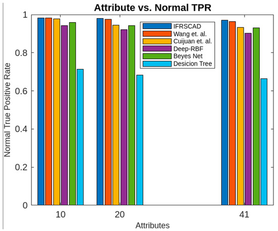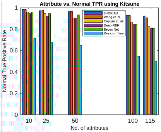 The bar diagram of Figure 8 represents the percentages of normal true positive rate of the aforesaid six algorithms (Wang et al.’s algorithm [35], Cuijuan et al.’s algorithm [17], deep-RBF network [16], Bayes network [15], decision tree [14], and IFRSCAD) for different attribute sizes, say 10, 25, 50, 100, and 41 of the dataset Kitsune [53]. Similarly, each colored bar represents one algorithm’s percentage of normal true positive rates.