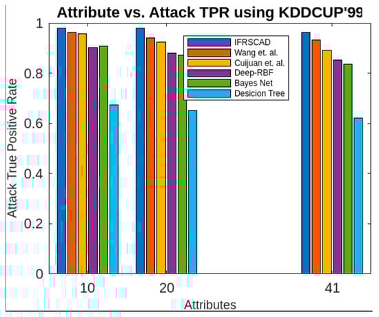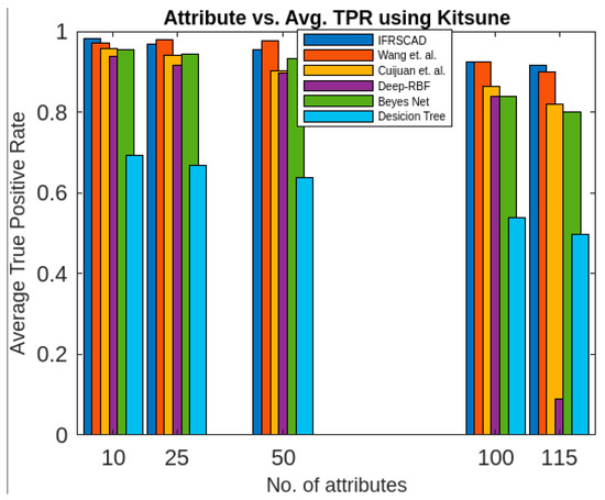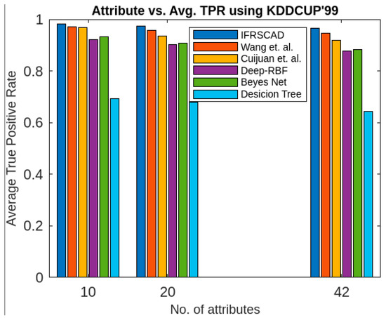 Again, the bar diagram of Figure 6 represents the percentages of the average true positive rate of the aforesaid six algorithms for different attribute sizes of KDDCUP’99 [52].