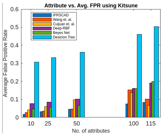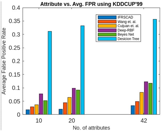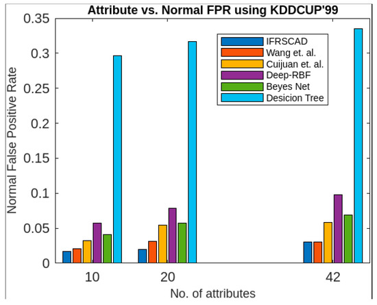 The bar diagram of Figure 4 represents the percentages of normal false positive rates of aforesaid algorithms for different attribute sizes of the dataset KDDCUP’99 [52].