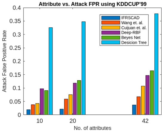 Again the bar diagram of Figure 5 represents the percentages of the attack false positive rates of the aforesaid six algorithms for different attribute sizes of the dataset KDDCUP’99 [52].