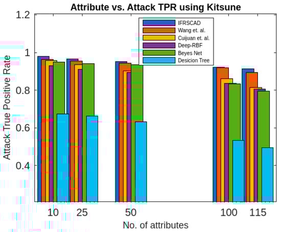 The bar diagram of Figure 9 represents the percentages of the attack true positive rate of six aforesaid algorithms (Wang et al.’s algorithm [35], Cuijuan et al.’s algorithm [17], deep-RBF network [16], Bayes network [15], decision tree [14], and IFRSCAD) for different attribute sizes of the dataset Kinsune [53].