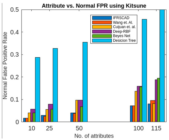 The bar diagram of Figure 10 represents the percentages of normal false positive rates of the six aforesaid algorithms (Wang et al.’s algorithm [35], Cuijuan et al.’s algorithm [17], deep-RBF network [16], Bayes network [15], decision tree [14], and IFRSCAD) for different attribute sizes of the dataset Kitsune [53].