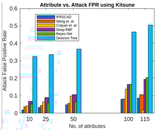 The bar diagram of Figure 11 represents the percentages of attack false positive rates of the six aforesaid algorithms (Wang et al.’s algorithm [35], Cuijuan et al.’s algorithm [17], deep-RBF network [16], Bayes network [15], decision tree [14], and IFRSCAD) for different attribute sizes of the Kitsune dataset [53].