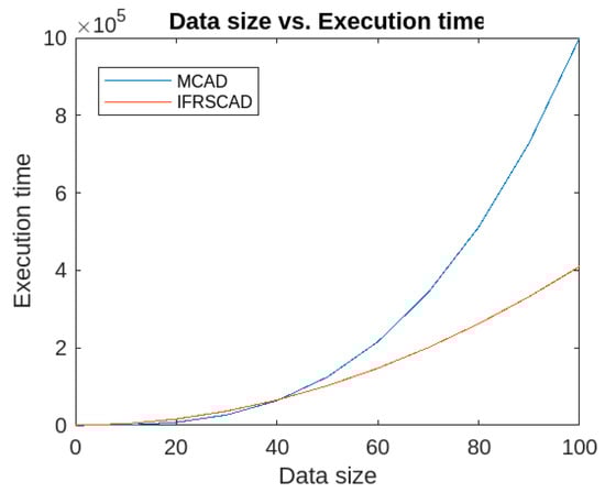 Furthermore, the IFRSCAD’s time-complexity is also analyzed against that of MCAD [30]. If the dimension of the dataset is assumed to be constant, the MCAD [30] runs in cubic time and IFRSCAD runs in quadratic time. Thus for large data size, the IFRSCAD outperforms MCAD [30]. The comparative analysis is presented graphically in Figure 16 below.