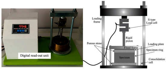 The constant volume method for measuring the swelling pressure is based on strain control techniques [15,16] including the zero-swell test and the direct method. The main difference between the two approaches is that the latter measures the swelling pressure directly using a pressure transducer, such as the S-type load cell shown in Figure 1. The zero-swell method prevents the specimen from expanding by applying a vertical stress, which is generally around the year 2000 [11,17]. It is challenging to guarantee optimal swelling readings and constant volume conditions during the test, and the soil pressure is very sensitive to load increments during the test [9,18], especially in the zero-swell test [14]. Furthermore, the swelling pressure will be overestimated due to the friction between the specimen and the consolidator ring during the recovery of the specimen to the initial volume [9]. In spite of this, the value measured with the zero-swell method is only one-third of the value measured with the swelling reloading test [9,17]. The reason is that the soil particles in the swelling reloading test are sufficiently hydrated, especially under low load conditions, whereas soil particle swelling is restricted and hydration is not sufficient in the constant volume method. Large errors with the direct method are due to the device’s characteristics, including the stiffness of the sensor [19,20], and the corresponding swelling pressure error can reach a maximum of 1–2 MPa [9].