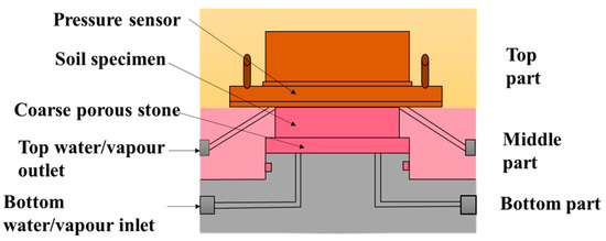 Many optimization test schemes were proposed according to the different properties of the above-mentioned test methods. For example, as early as in 1975, Bishop et al. [23] proposed a triaxial instrument that could directly measure the vertical swelling of a sample in a hydraulic triaxial stress path cell; it could predict the swelling potential of the soil under test better than the consolidation test method [11]. A new constant-volume sensor, developed by Tang et al. [9], could measure the swelling pressure without both any strain adjustment and the influence of test equipment stiffness, thereby reducing the measurement errors (Figure 2). To reduce diaphragm deformation under external pressure, a mercury-filled pore gap is introduced below the diaphragm in the BER-A-58S pressure sensor utilized in the upper portion. The upper-pressure transducer is in contact with the upper surface of the sample for the direct measurement of the swelling pressure. Figure 3 shows the diagram equipped with this pressure transducer used with the constant volume method without manual load adjustment, which makes it very convenient for monitoring the long-term changes in swelling pressure.