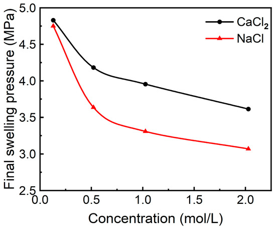 Studies have shown that the increase of the pore solution concentration leads to a decrease in bentonite expansibility [3,36,37]. Different types of solutions have different effects on the swelling pressure of bentonite.