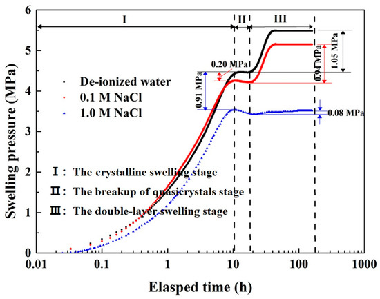 As shown in Figure 6, where the effect of temperature was ignored, the constant-volume swelling pressure test was performed on GMZ Na–bentonite with 75.4% bentonite, initial water content of 11.92%, dry density of 1.7 Mg/m3; the swelling pressure curve showed three phases [24]. Analogously, when the dry density was high, 1.7 Mg/m3, and the initial water content was relatively low, i.e., 10.76%, the swelling process under the action of the saline solution comprised three stages: firstly, crystalline swelling, followed by the breakup of quasicrystals, and then double-layer swelling [26]. The first stage was characterized by a rapid increase in the swelling pressure, marked by increased interlayer cation hydration, and as the cation concentration continued to increase, water molecules within the crystals left the crystal layer, which gradually inhibited the swelling of the crystal layer [46]. The second stage was the transition from crystalline to permeable swelling, with a small decrease in the swelling pressure due to the swelling of soil particle agglomerates and the collapse of the soil skeleton, which was manifested by the splitting of thick quasicrystals into fine quasicrystals and the filling of large pores (inter-agglomerate pores). The third stage was the double-layer swelling stage, where the swelling pressure increased again, and the crystalline swelling became less pronounced; for specimens infiltrated with the salt solution or distilled water, the final swelling pressure in this stage was maintained in equilibrium [47].