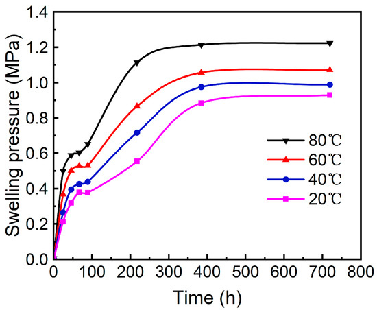 Elevated temperatures can have an impact on bentonite and its engineering properties. For example, simulations of high-discharge waste disposal in China have shown that thermal swelling and saturation processes may affect a tank stability for long periods [52], as higher temperatures can provoke montmorillonite dehydration [53]. The effect of temperature on the swelling pressure is highly controversial. Liu et al. [25] used distilled water and performed constant-volume swelling pressure tests on GMZ bentonite particle mixtures at different temperatures. It was shown that the swelling pressure changed faster and gradually increased with higher temperatures (Figure 7). A similar phenomenon was also indicated by some related studies [5,54]. Nevertheless, other tests also showed that the swelling pressure decreased with the increasing temperature [55,56,57,58].