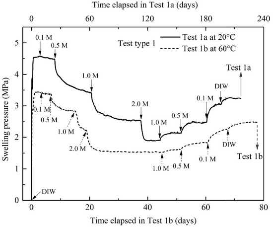 Chen et al. [28] conducted alternating wetting tests using distilled water and NaCl solutions of different concentrations on Na–GMZ bentonite with an initial dry density of 1.7 g/cm3 at 20 °C and 60 °C, as shown in Figure 8. The results showed that when the thermo-chemical effect was coupled, the increase of temperature and electrolyte concentration was not conducive to the development of swelling pressure, and in the multi-step salination–desalination process, the initial swelling pressure of the sample could not be fully restored after saline circulation. The possible causes were the irreversible interpore collapse and the further homogenization of the clay structure at the macrostructural level.